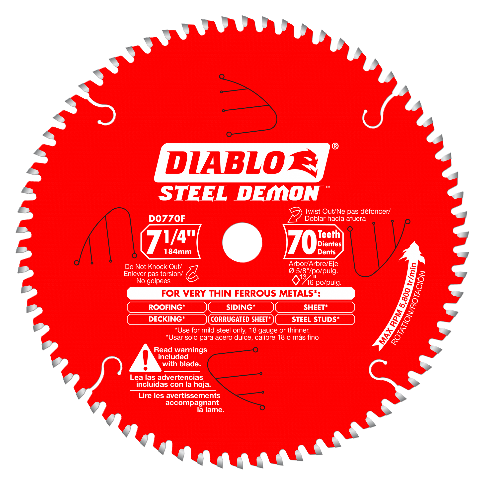 Diablo's Steel Demon metal cutting saw blades produce fast, accurate cuts in a wide-range of mild steels. These blades feature Diablo made TiCo Hi-Density Carbide engineered exclusively to deliver maximum performance, superior quality cuts and longer life when compared to standard grinding discs. Designed with a Triple Chip Grind (TCG) and Perma-SHIELD coating, these blades slice through the toughest of metals to produce precise, burr-free cuts with less sparks. A controlled cutting action produces larger chip sizes that generates less dust and airborne contaminates. The thin kerf body minimizes material removal and requires less cutting power, delivering fast, clean cuts in cordless and corded circular saws.