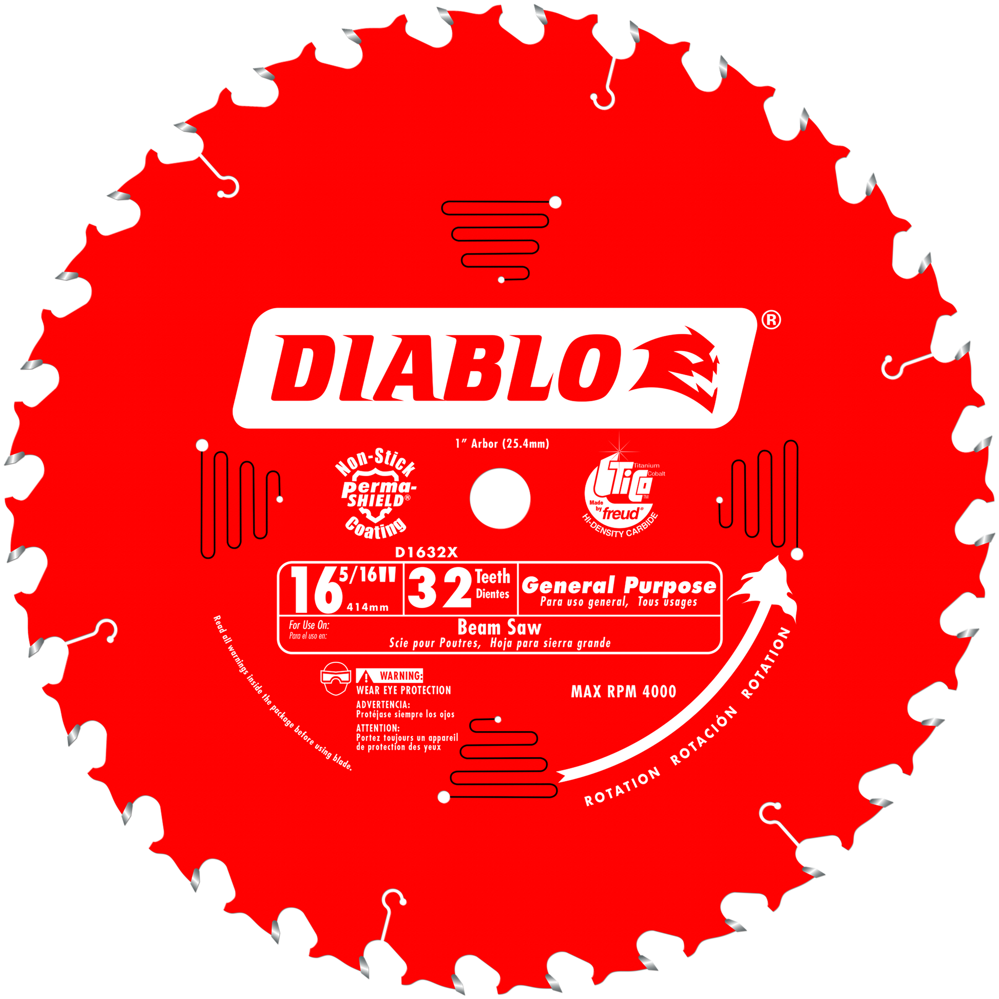 Diablo's 16-5/16" general purpose beam saw blade is ideal for cutting oak, pine, plywood, pressure treated lumber, Wood Composites, and beams. Diablo's 16 5/16"x32t ATB general purpose saw blade for large capacity Beam Saws. Ideal for timber framing such as laminated veneer lumber, glued timber (glulams),and Paralams.