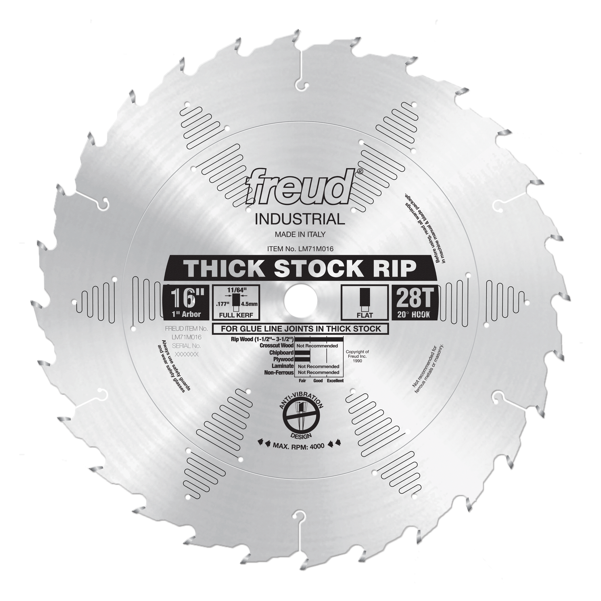 (LM71M016, 16 x 28 x 1" Bore, 20˚ Hook Angle, .177" Kerf, .118" Plate, FLAT Thick Stock Rip Blade