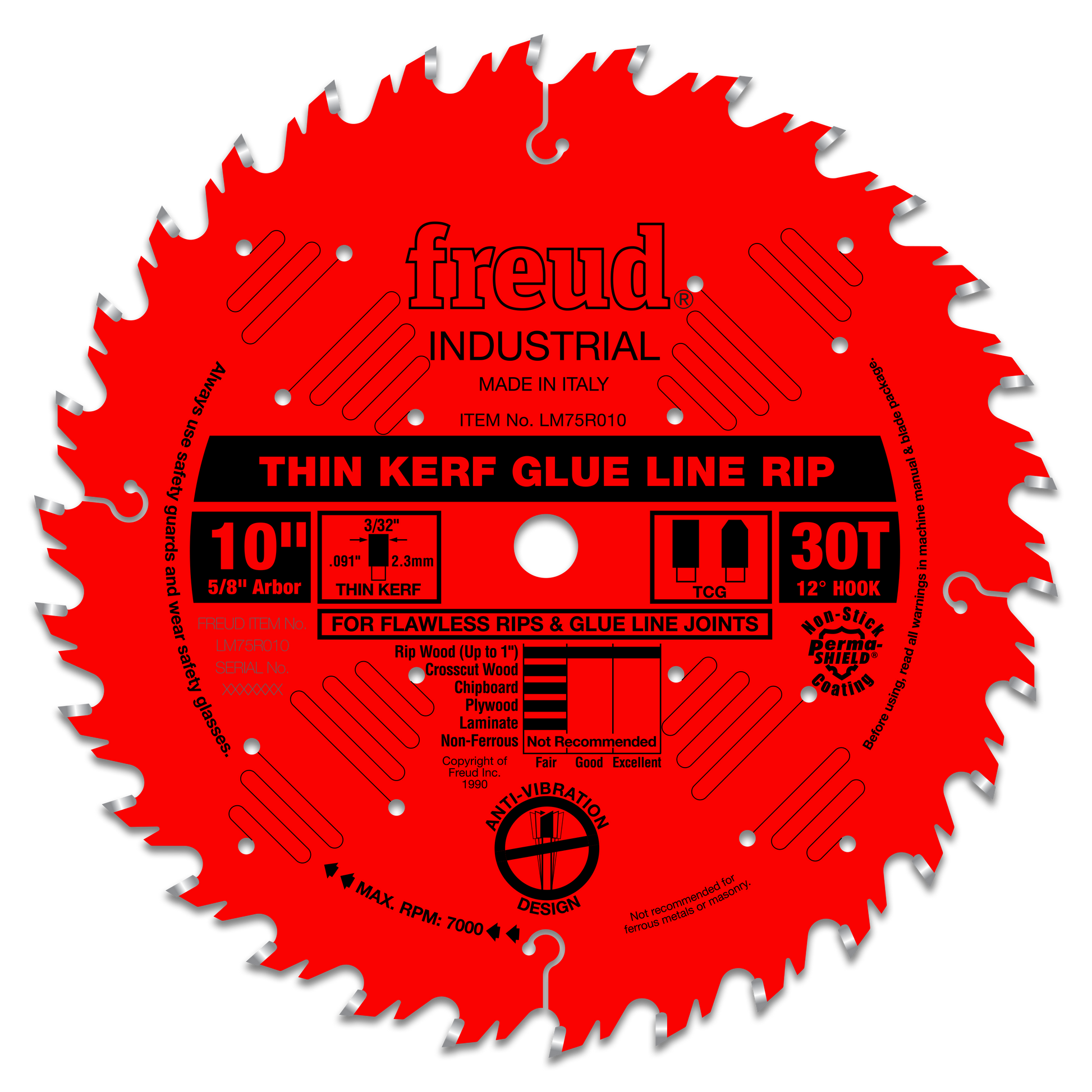 (LM75R010, 10 x 30 x 5/8" Bore, 12˚ Hook Angle, .091" Kerf, .071" Plate, TCG Thin Kerf Glue Line Rip Red PermaShield Blade
