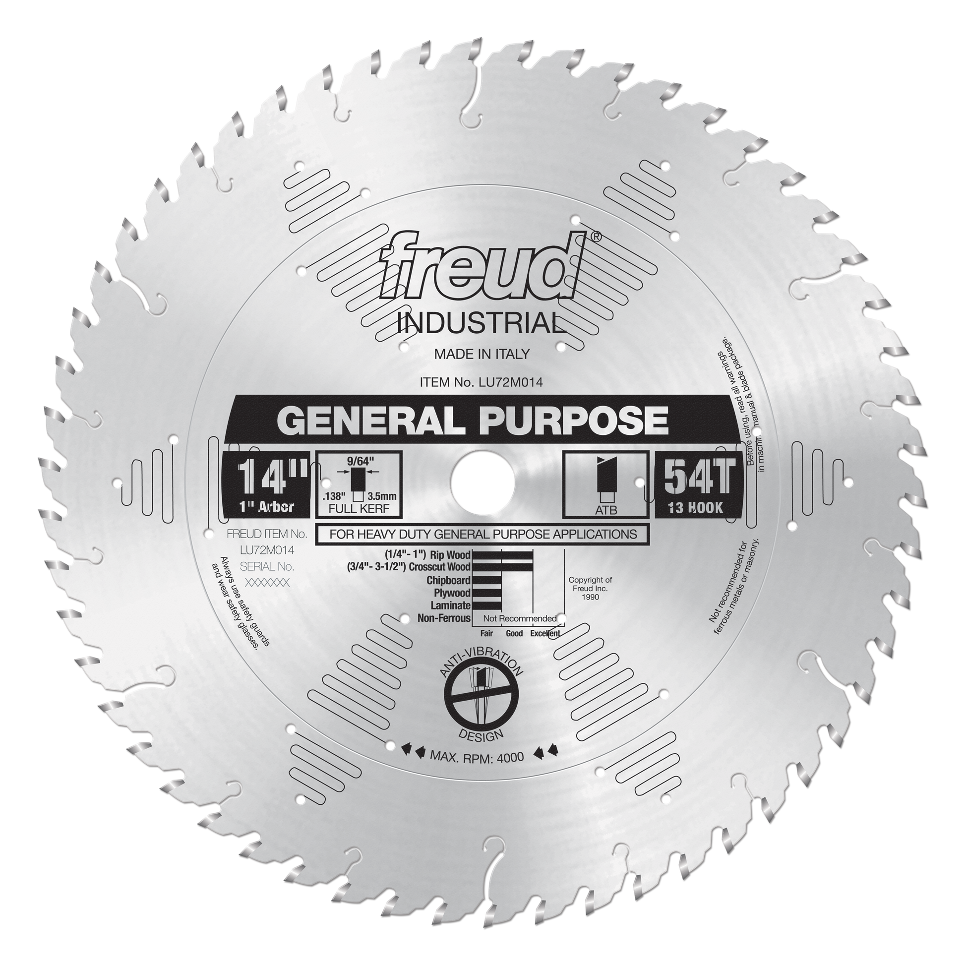 (LU72M014, 14 x 54 x 1" Bore, 13˚ Hook Angle, .138" Kerf, .098" Plate, ATB General Purpose Saw Blade