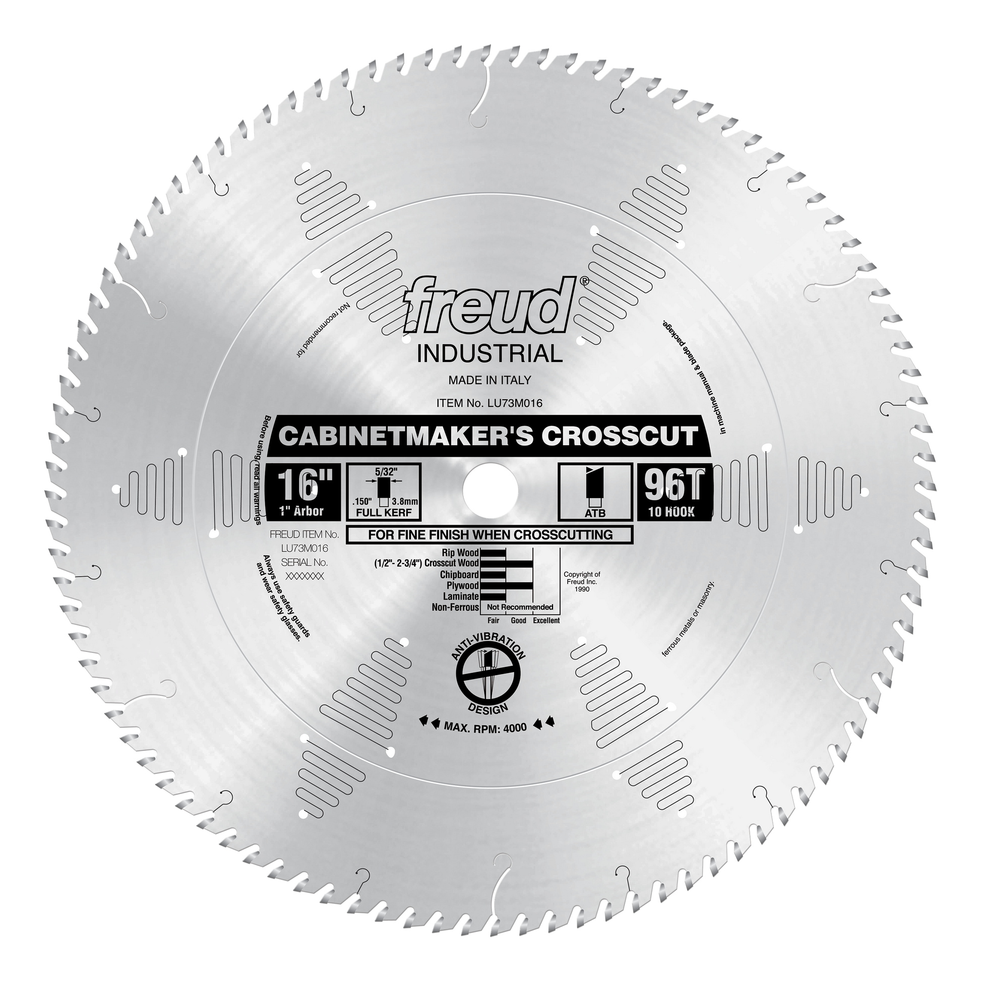 (LU73M016, 16 x 96 x 1" Bore, 10˚ Hook Angle, .150" Kerf, .110" Plate, ATB Cabinetmaker's Crosscut Saw Blade