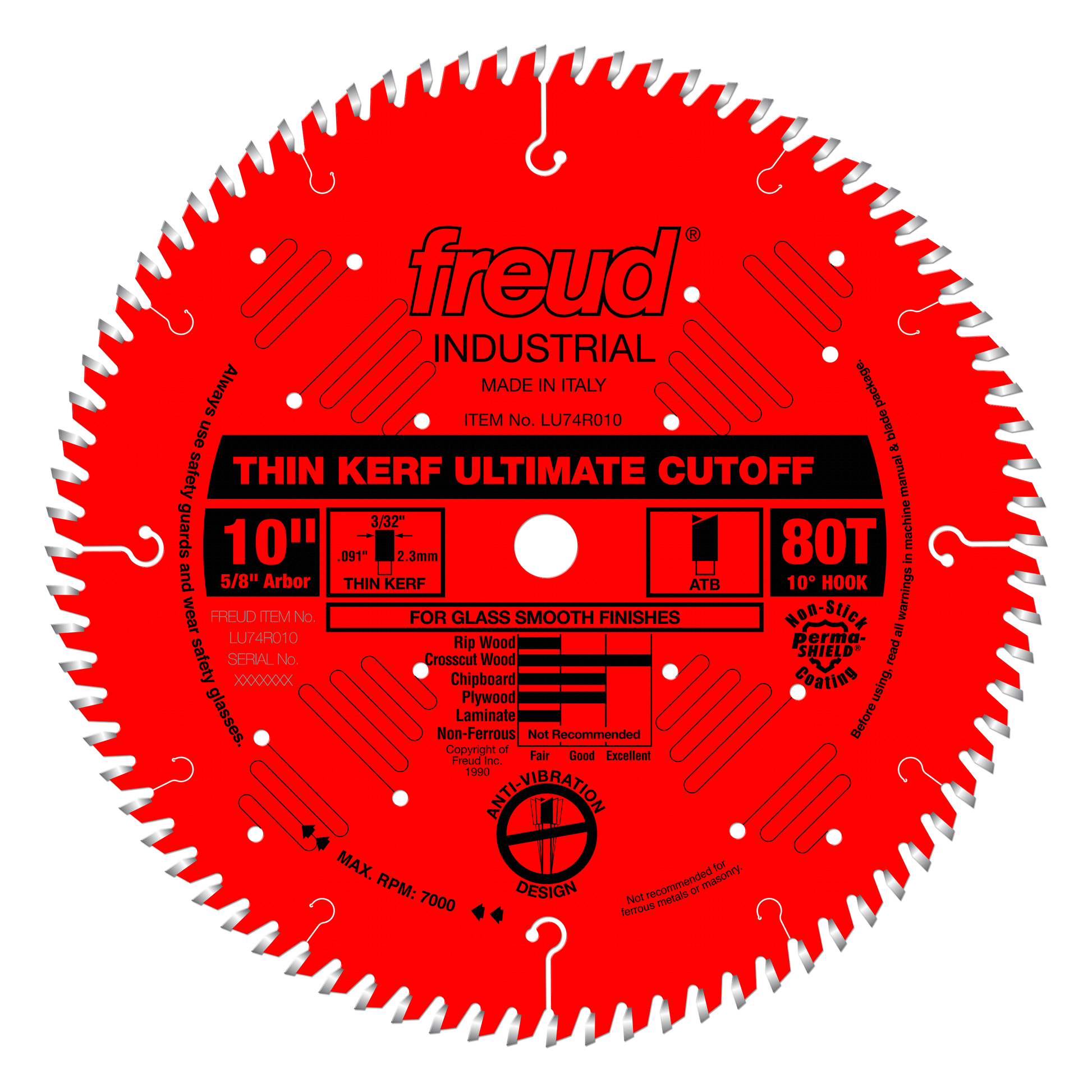 (LU74R010, 10 x 80 x 5/8" Bore, 10˚ Hook Angle, .091" Kerf, .071" Plate, ATB Thin Kerf Cut-Off Saw Blade
