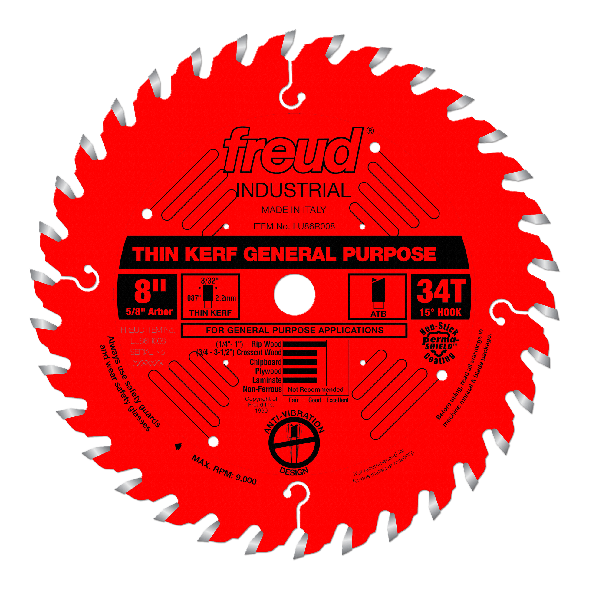 (LU86R008, 8 x 34 x 5/8" Bore, 13˚ Hook Angle, .087" Kerf, .063" Plate, ATB Thin Kerf General Purpose Saw Blade