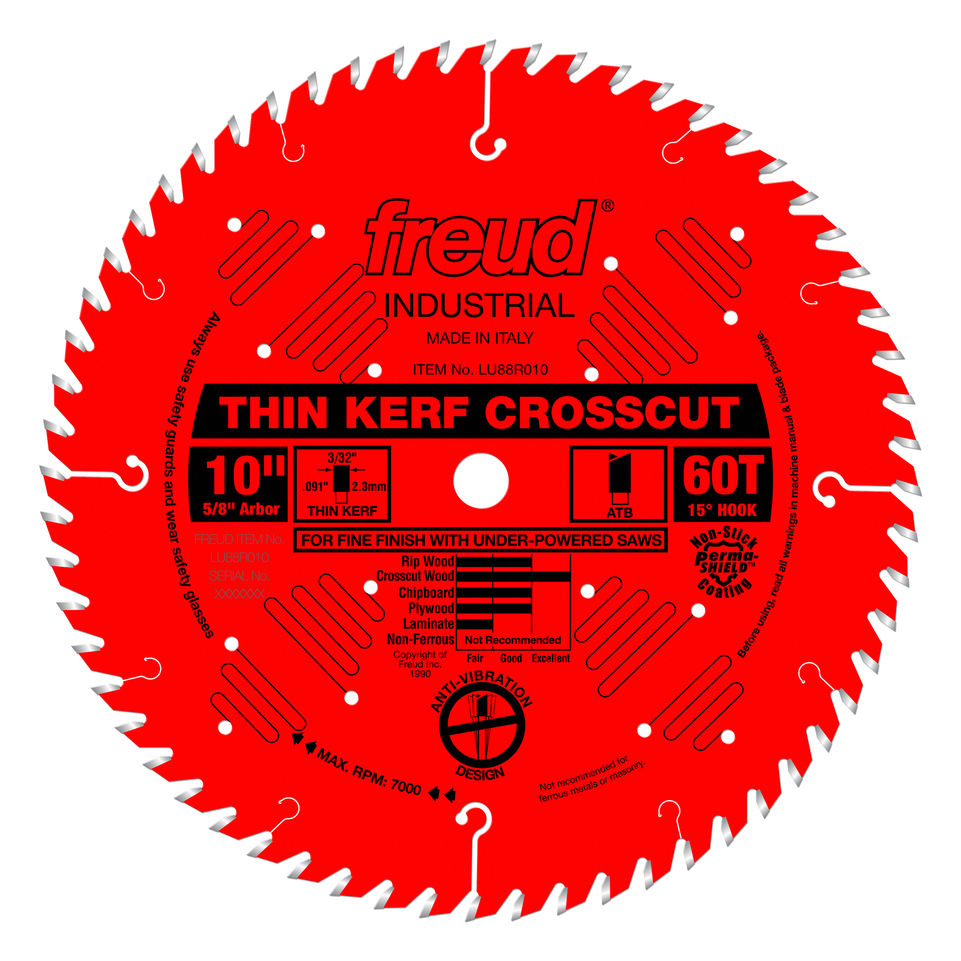 (LU88R010, 10 x 60 x 5/8 Bore, 15˚ Hook Angle, .090" Kerf, .071" Plate, ATB Thin Kerf Fine Finish Red Perma Shield Saw Blade