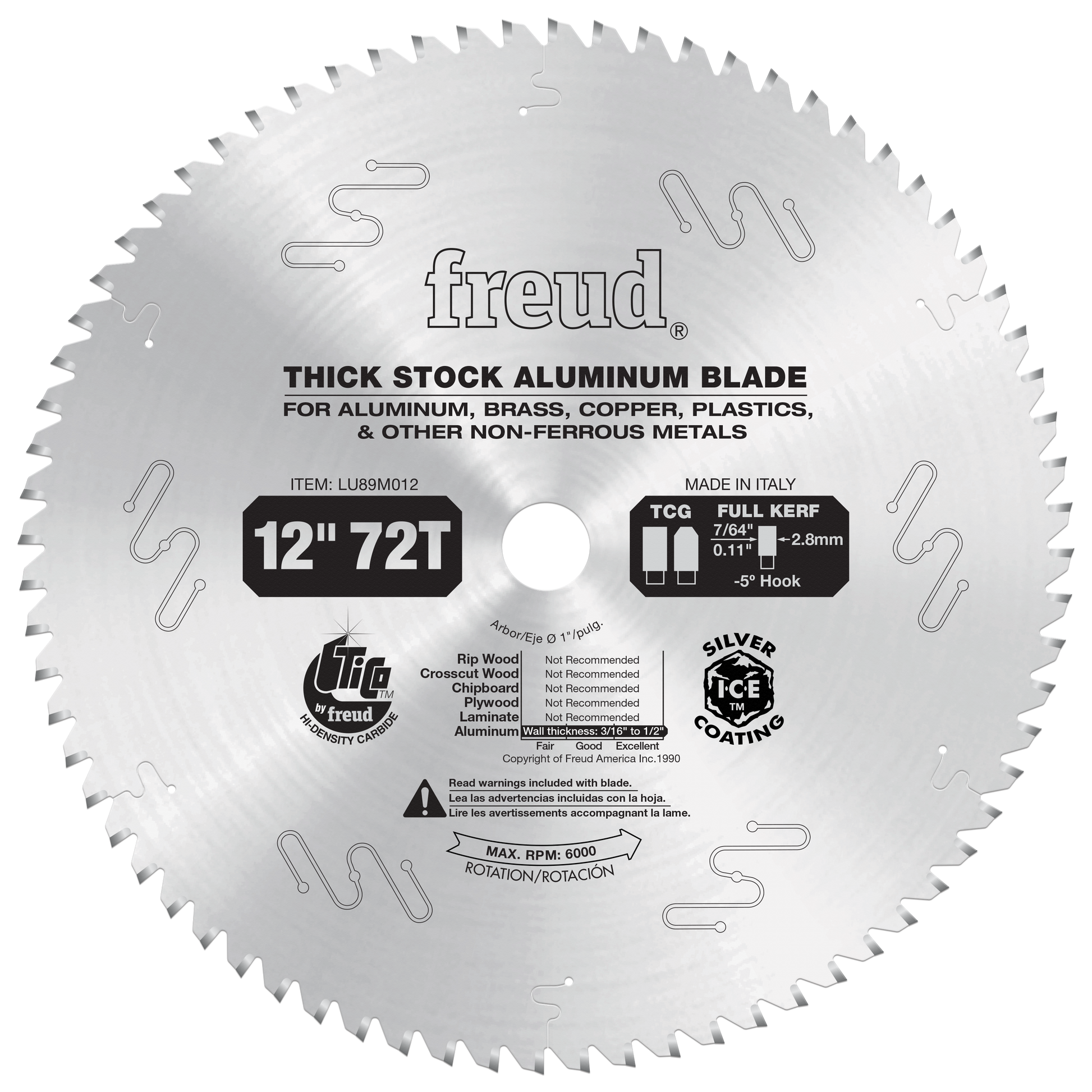 This thick stock, non-ferrous metal cutting blade produces an excellent finish. These blades have custom designed gullets to minimize chip build-up and specially formulated carbide for long life. Freud recommends use of a liquid lubricant when cutting. This can be accomplished with a spray of WD-40 or other lubricant every 4 to 5 cuts. Wax sticks are not recommended