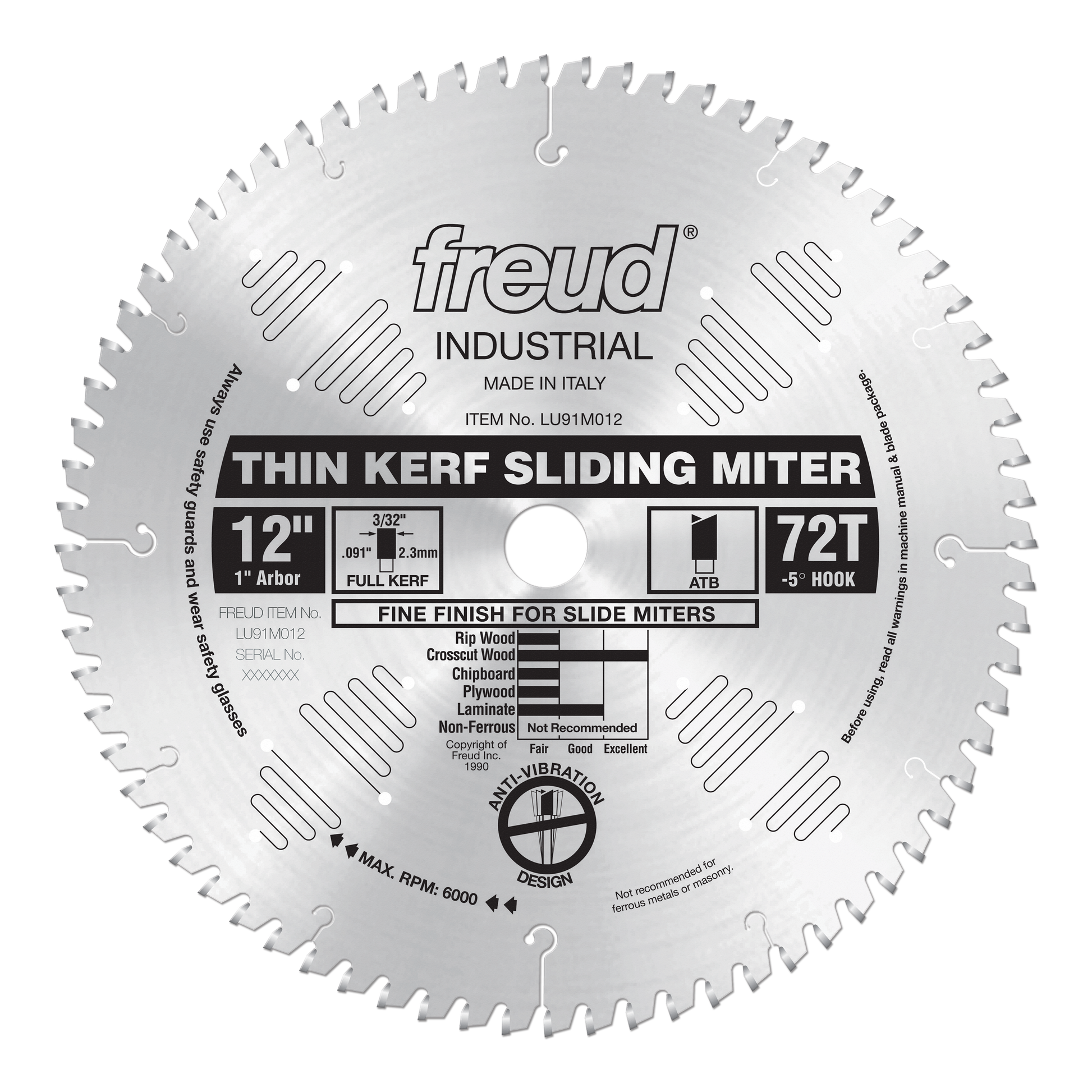 (LU91M012, 12 x 72 x 1" Bore, -5˚ Hook Angle, .090" Kerf, .071" Plate, ATB Thin Kerf Sliding Compound Miter Saw Blade