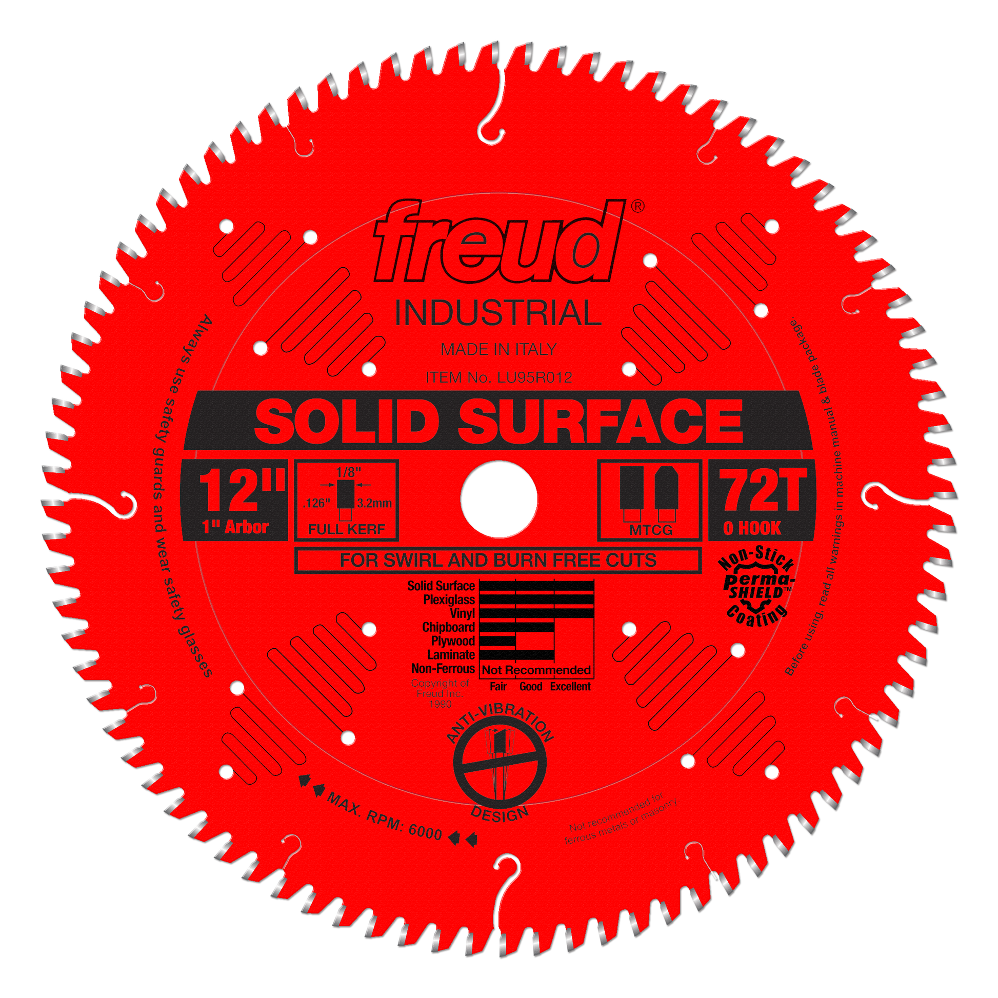 (LU95R012, 12 x 84 x 1" Bore, 0˚ Hook Angle, .126" Kerf, .087" Plate, MTCG Solid Surface Saw Blade