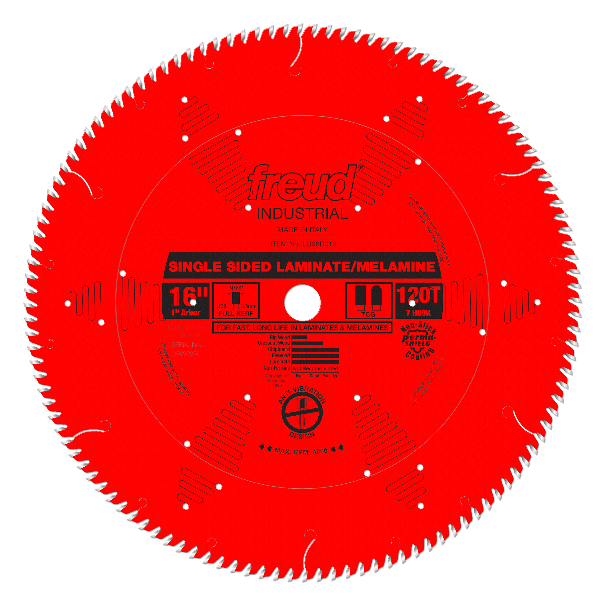 (LU98R016, 16 x 120 x 1" Bore, 10˚ Hook Angle, .150" Kerf, .110" Plate, TCG Single-Sided Laminate Red Saw Blade