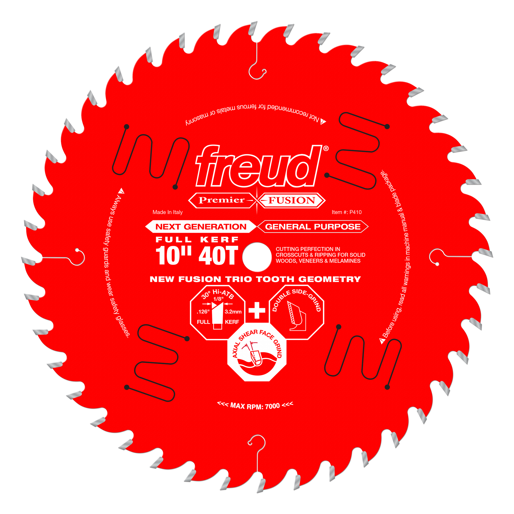 Freud's Next Generation Premier Fusion featuring the radical new Fusion Trio Tooth Design is the most technologically advanced general purpose blade on the market! Freud has designed these unique blades with a new radical tooth design called Fusion Trio which combines a special grind for the top, sides, and face of each tooth. This one-of-a-kind tooth geometry includes a 30 degree Hi-ATB, a double grind design, and an Axial Shear Face Grind to produce the ultimate polished finish in ripping and crosscutting applications with minimal resistance as it glides through in the material. Whether you're ripping or crosscutting, the next generation Premier Fusion blade is the best for flawless cuts in laminates, melamine, veneered plywoods, hardwoods, softwoods, and thick stock lumber.