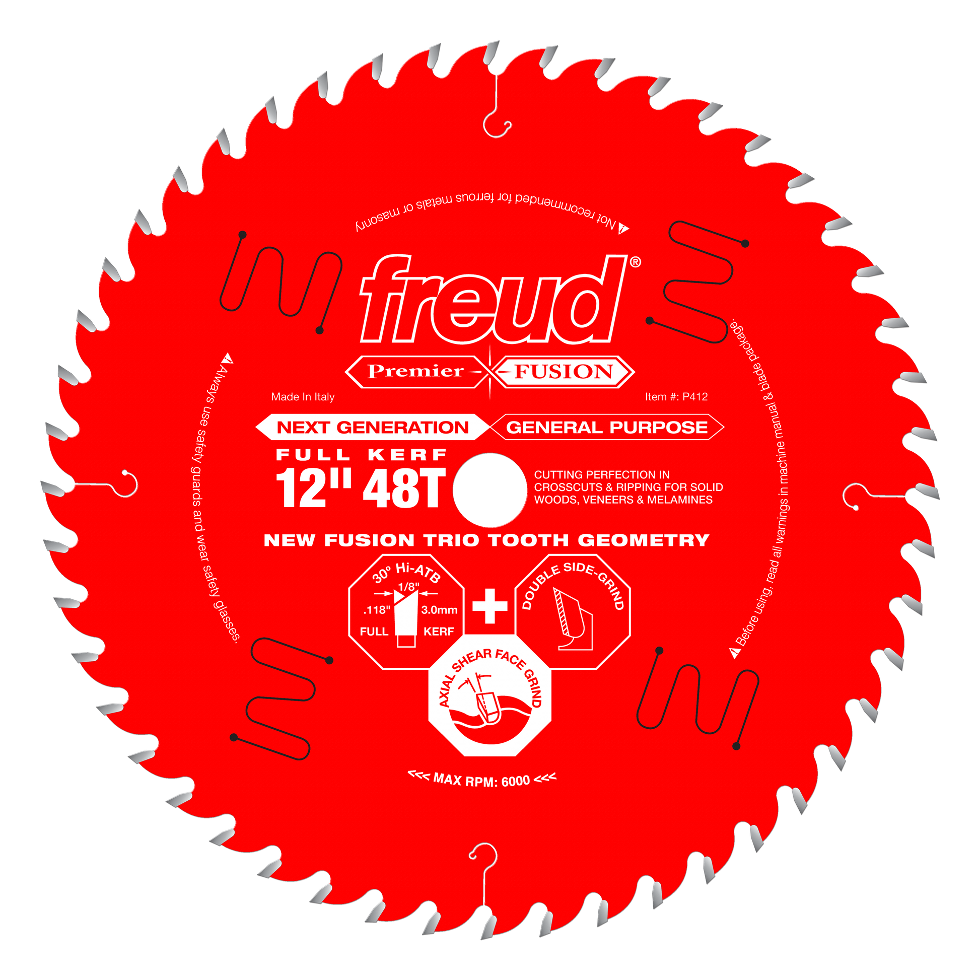 Freud's Next Generation Premier Fusion featuring the radical new Fusion Trio Tooth Design is the most technologically advanced general purpose blade on the market! Freud has designed these unique blades with a new radical tooth design called Fusion Trio which combines a special grind for the top, sides, and face of each tooth. This one-of-a-kind tooth geometry includes a 30 degree Hi-ATB, a double grind design, and an Axial Shear Face Grind to produce the ultimate polished finish in ripping and crosscutting applications with minimal resistance as it glides through in the material. Whether you're ripping or crosscutting, the next generation Premier Fusion blade is the best for flawless cuts in laminates, melamine, veneered plywoods, hardwoods, softwoods, and thick stock lumber.
